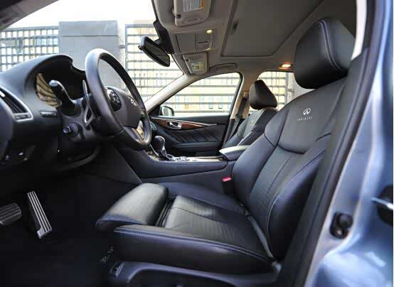 它的座椅的舒适度很强,支撑性和包裹性都不错,采用的真皮包裹的座椅,后方背部地方嗨哟缝线上去的英菲尼迪的车标。