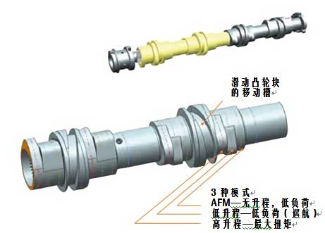 Tripower的特征是,具有一根沿着凸轮轴进行移动的管套,像蜗杆轨迹一样的移动槽用于啮合不同的凸轮块。在发动机顶部的电子机械执行器适时可将压杆插入槽内,当凸轮转动时管套进行滑动,凸轮块就可逐步移动到三种运行模式中的任何一种。
