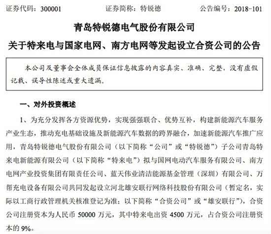 2018年12月21日上午,国家电网公司、南方电网公司、特来电、万帮四家充电行业巨头在河北雄安新区签署合作协议,共同出资成立合资公司,以加快充电基础设施建设、解决长期困扰新能源汽车发展的充电设施互联互通等问题。
