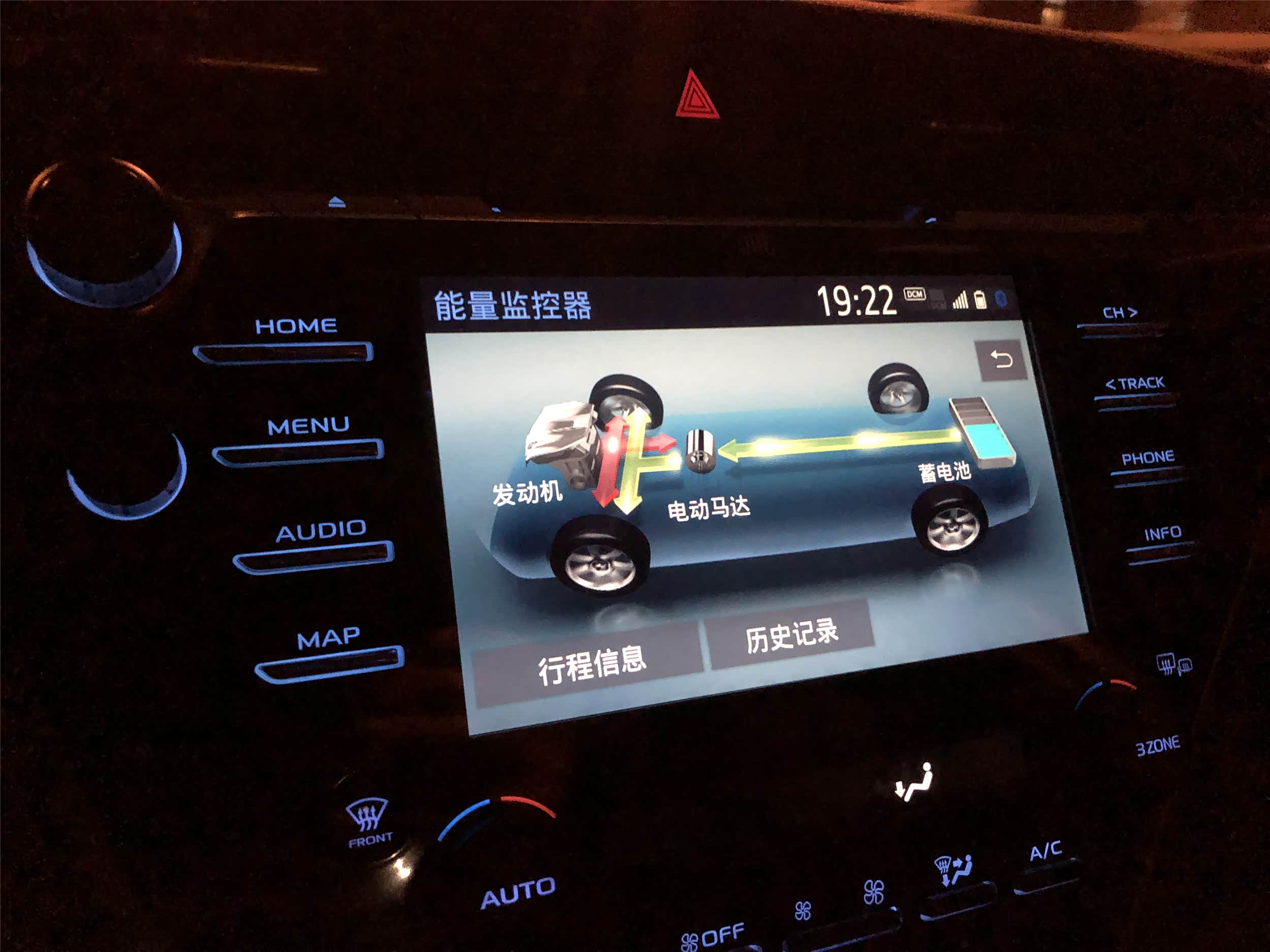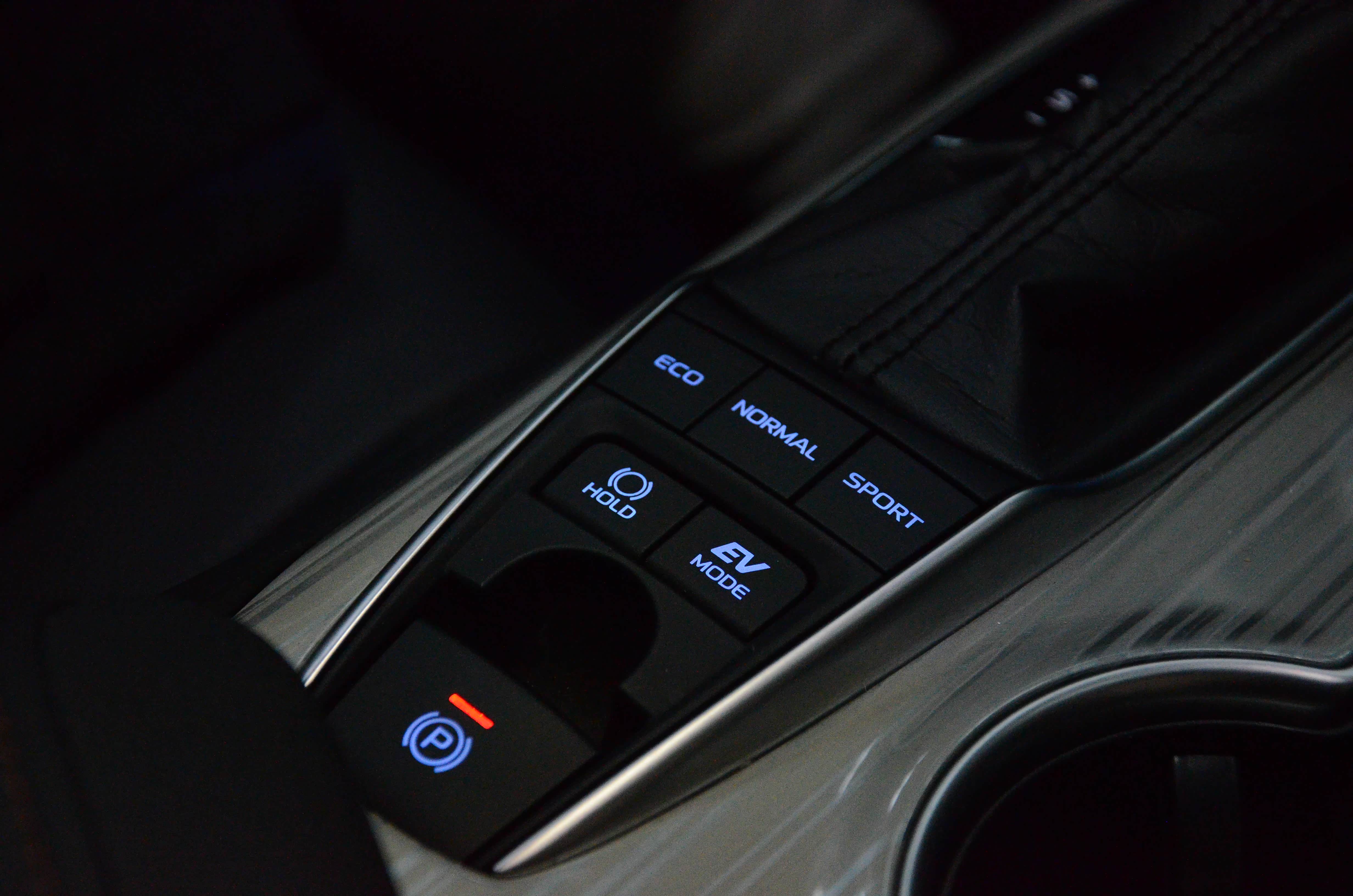 2.混动版也提供了三种驾驶模式选项,并且还提供手动模式,虽然没有配备拨片,但也足够让我惊讶了。在挡把后方还提供了纯电模式的按钮,不过在纯电模式下油门稍微踩深一些发动机还是会介入提供动力。凯美瑞混动的电池似乎很难被充满,可能是出于保护电池寿命的原因,在我使用中最多充到了六格。