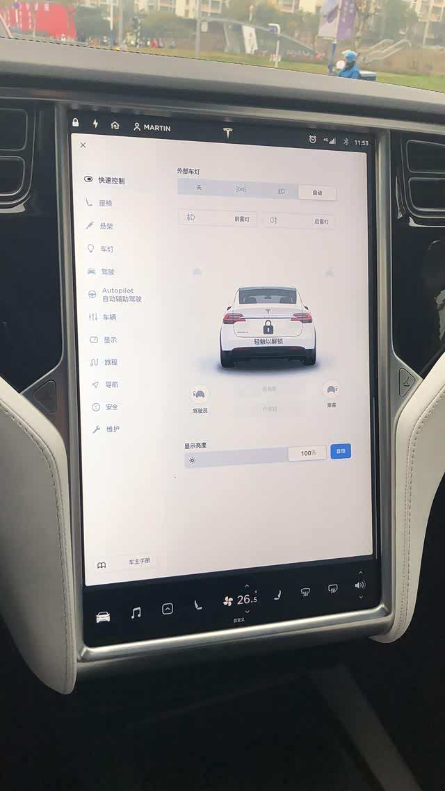 内饰上最抢眼也最有特色的,肯定是那块硕大的中控屏幕。整个屏幕几乎把中控台沾满,尺寸比iPad还大两圈,而周围几乎没有任何物理按键,Model X 100D的绝大部分功能是通过屏幕来操控的,包括导航、开关门、空调、阅读灯、驾驶模式等等。