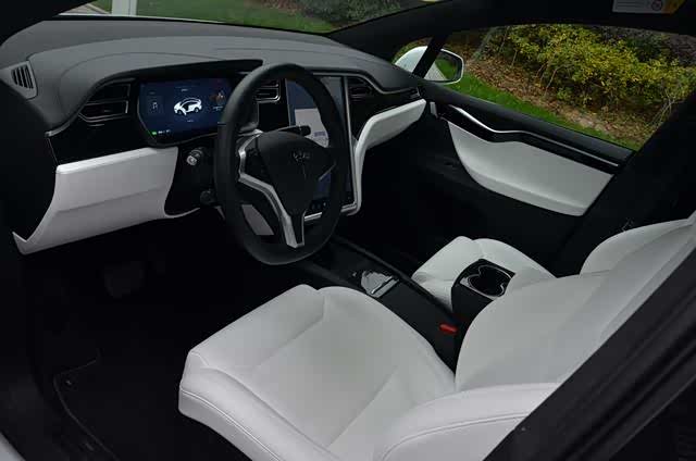 在狠狠的满足了一把虚荣心之后,我激动地打开车门坐到了驾驶座。与外观一样,Model X 100D的内饰也延续了简洁科幻的风格,整个内饰绝大部分区域采用皮质包裹,黑白相间的皮质质感很不错,搭配上光滑的木纹装饰,透露着一股轻奢感。这样的搭配是我非常喜欢的类型,既不会显得低端,也不会因为太奢华而透露着一股子暴发户的味道。