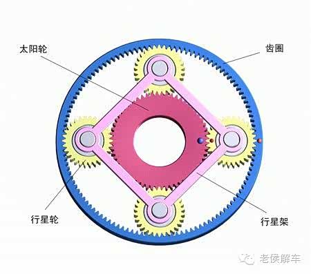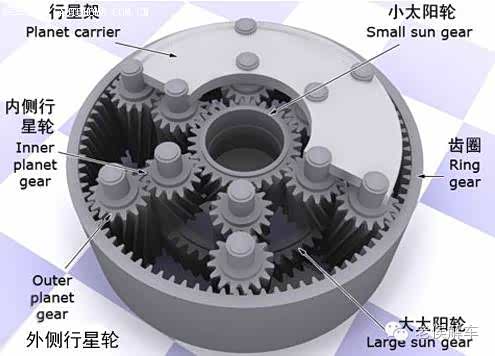 它由太阳轮或称为中心轮、行星齿轮、行星齿轮架,通常简称为行星架、齿圈等组成。