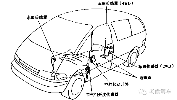 自动变速器电控系统一般由电子控制单元、速度传感器、节气门位置传感器、各种电磁阀、各种开关及指示装置等构成。
