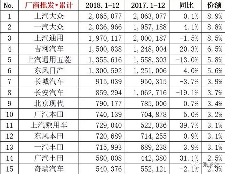 2018年,中国汽车市场销量退坡,市场整体增速逐渐放缓,全年市场销量在20年来首次出现下滑。过去的一年,国内乘用车全年批发累计2323.7万辆,同比下降4.0%,全年零售新车量为2235.1万辆,同比下降5.8%。而在凛冽的寒冬中,依旧有诸多品牌坚挺的绽放,成为一枝独秀。乘联会报告指出,排名前3的依旧是上汽大众、一汽-大众和上汽通用。其中上汽大众已是连续第三次批发销量突破200万辆,达到了2,065,077辆,继续蝉联乘用车年度销量冠军;一汽-大众同时跨入200万辆台阶,达到了2,036,966辆,同比增长4.1%,位列第二;上汽通用销量1,970,117辆,位居第三。