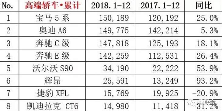 与市场发展趋势逆流而上的,是豪华品牌轿车,BBA依旧包揽全年前四的细分车型市场。2018年,宝马5系全年销量大幅度增长25%,位居全年销量榜单首位。但仔细来看,奔驰E级虽排名第四,但全年销量同比大幅度增长26.4%,与5系仅相差7千多辆,整体差距很小。沃尔沃品牌,S90的推出又给消费者多了一层选择,并成功抢占了不少细分市场。数据显示,沃尔沃S90在2018年全年销量达到了34,190辆,同比上涨幅度达到了53.9%。同时,上汽大众辉昂,全年销量也实现大幅度增长93.2%。