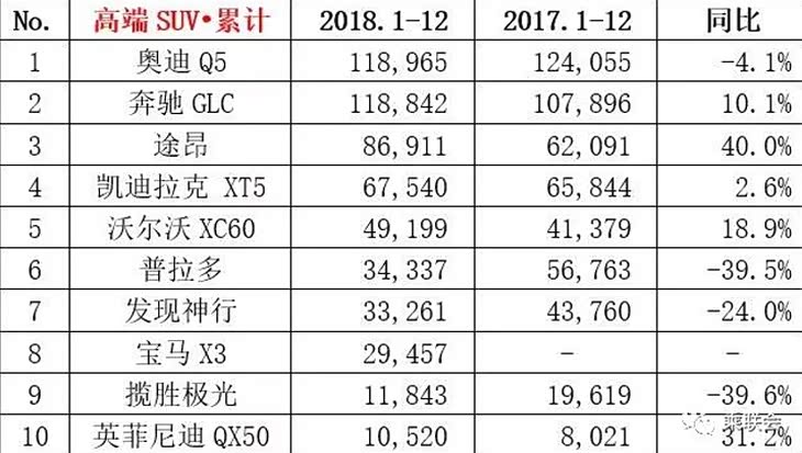 在豪华品牌SUV中,奥迪Q5销量下滑严重,12月单月下滑40.5%,全年下滑4.1%。奔驰品牌,GLC保持了良好的市场表现,全年增长10.1%。另外值得一提的是,上汽大众途昂全年销量高达86,911辆,同比大幅度上涨40%,成为2018年SUV车型中增速最快的高端SUV产品。