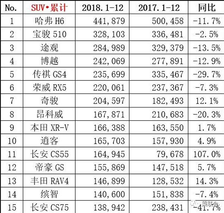 在SUV阵营中,一代神车哈弗H6全年销量下降11.7%,为441,879辆;宝骏510下降2.5%,长安CS75下滑41.7%,就连销量王途观、博越等产品在2018年全年的表现也不尽如人意。在MPV市场,五菱宏光、别克GL8下滑趋势明显,但宋MAX、上市不久的别克GL6以及传祺GM8等在市场中受消费者喜欢的程度较高。