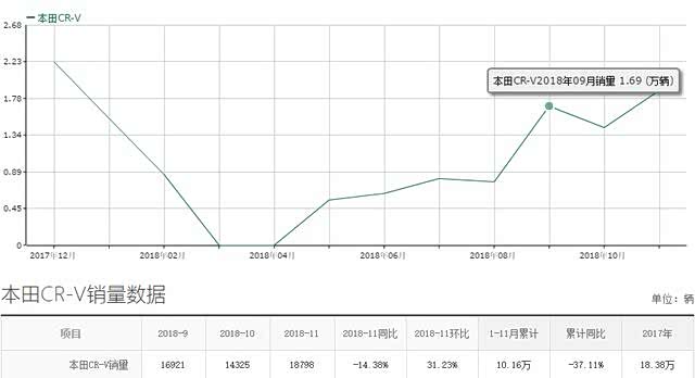 不过东风本田CR-V的年销量却与奇骏,途观相差甚远,前十一个月的总销量勉强突破10万辆,加上12月份的销量,年总销量也才13万辆出头,未挤入2018年SUV年总销量的前十五,毕竟上半年有停卖两个月,加上复出后很多消费者怀有畏惧心理,五到八月份销量都未破万,所以2018年算是东风本田CR-V的一个历史时刻。