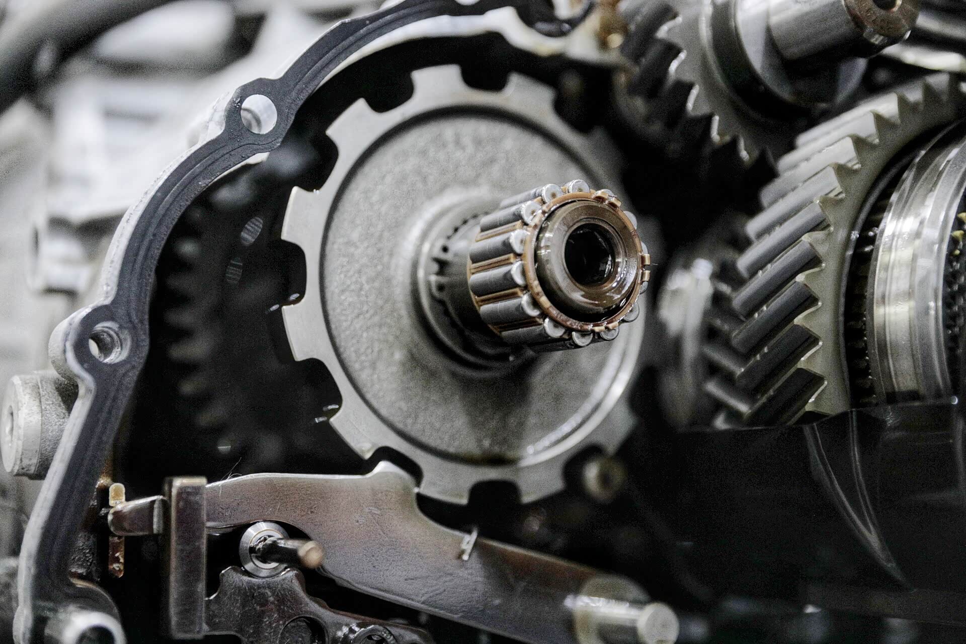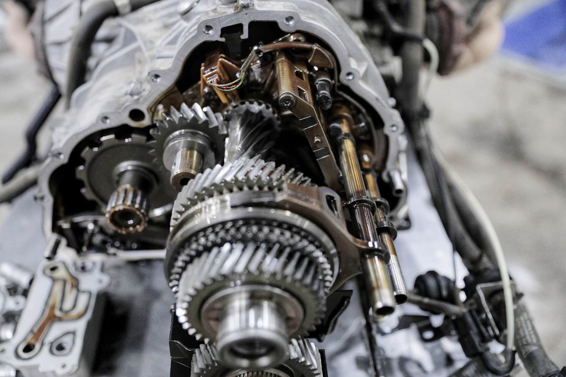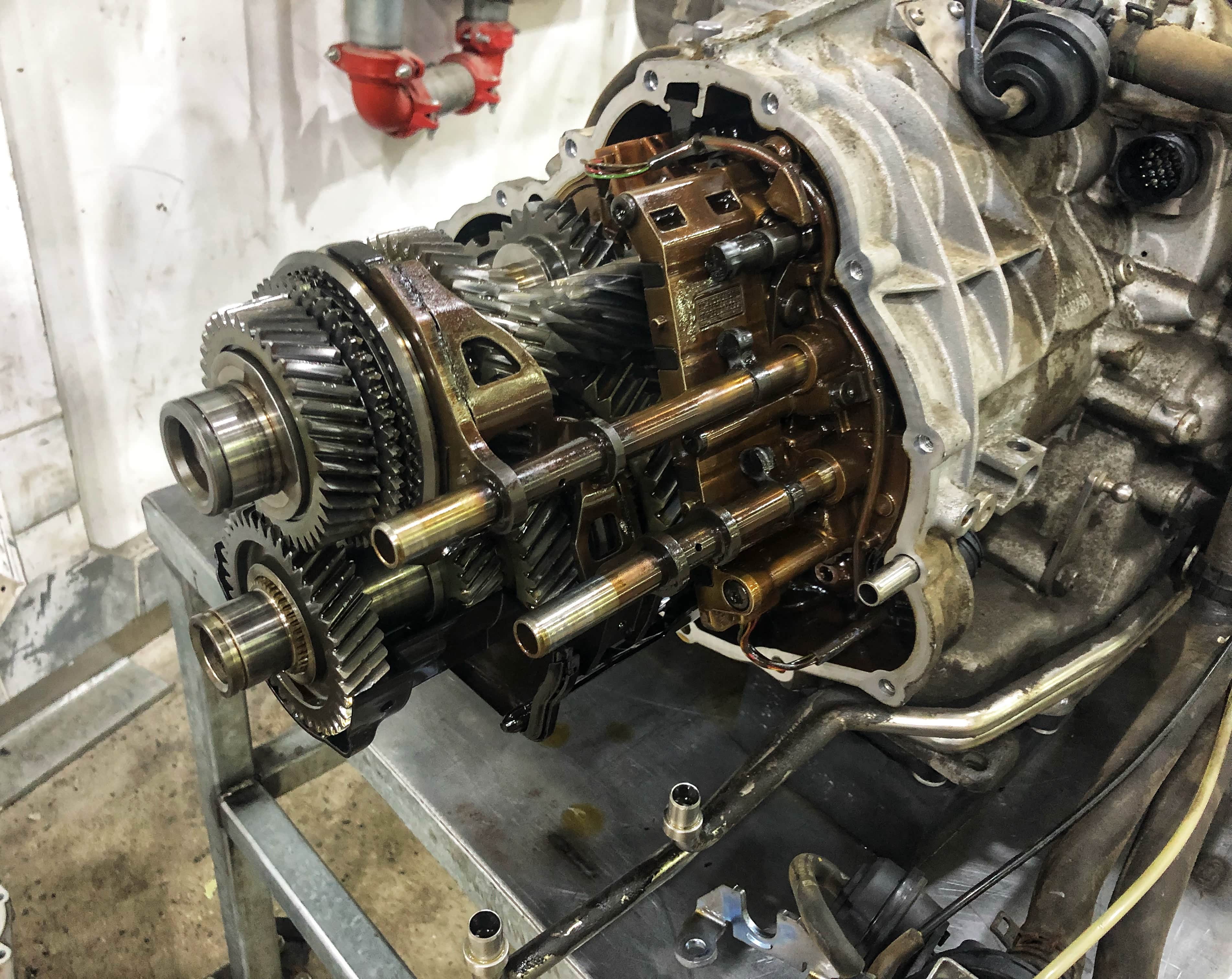 打开的变速箱可以清晰的看见两根主轴,一根为1、3、5、7挡齿,另外一根为2、4、6挡齿,倒车挡齿单独控制。其实这些看似很平常,但真正核心的东西是换挡执行器。这辆车的换挡执行器相当昂贵,不仅仅是因为材质以及货源的问题,更多的是缜密的换挡执行逻辑。