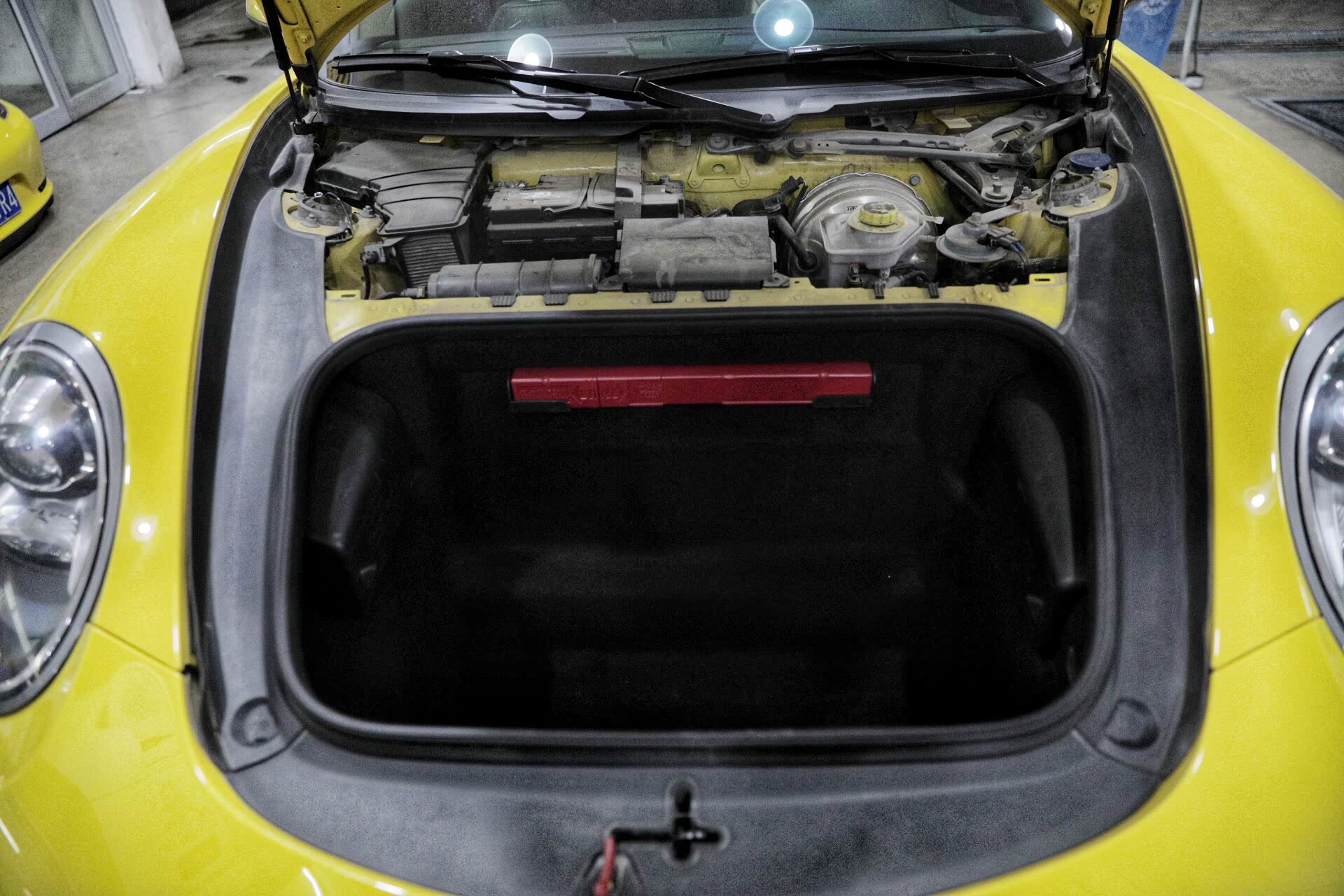 众所周知,保时捷911车型为后置后驱的布局,所以前面为行李厢以及相关配件来进行配重。有限的重量来源于油箱、空调系统以及电瓶,这样的设计也是最大限度的提升操控。