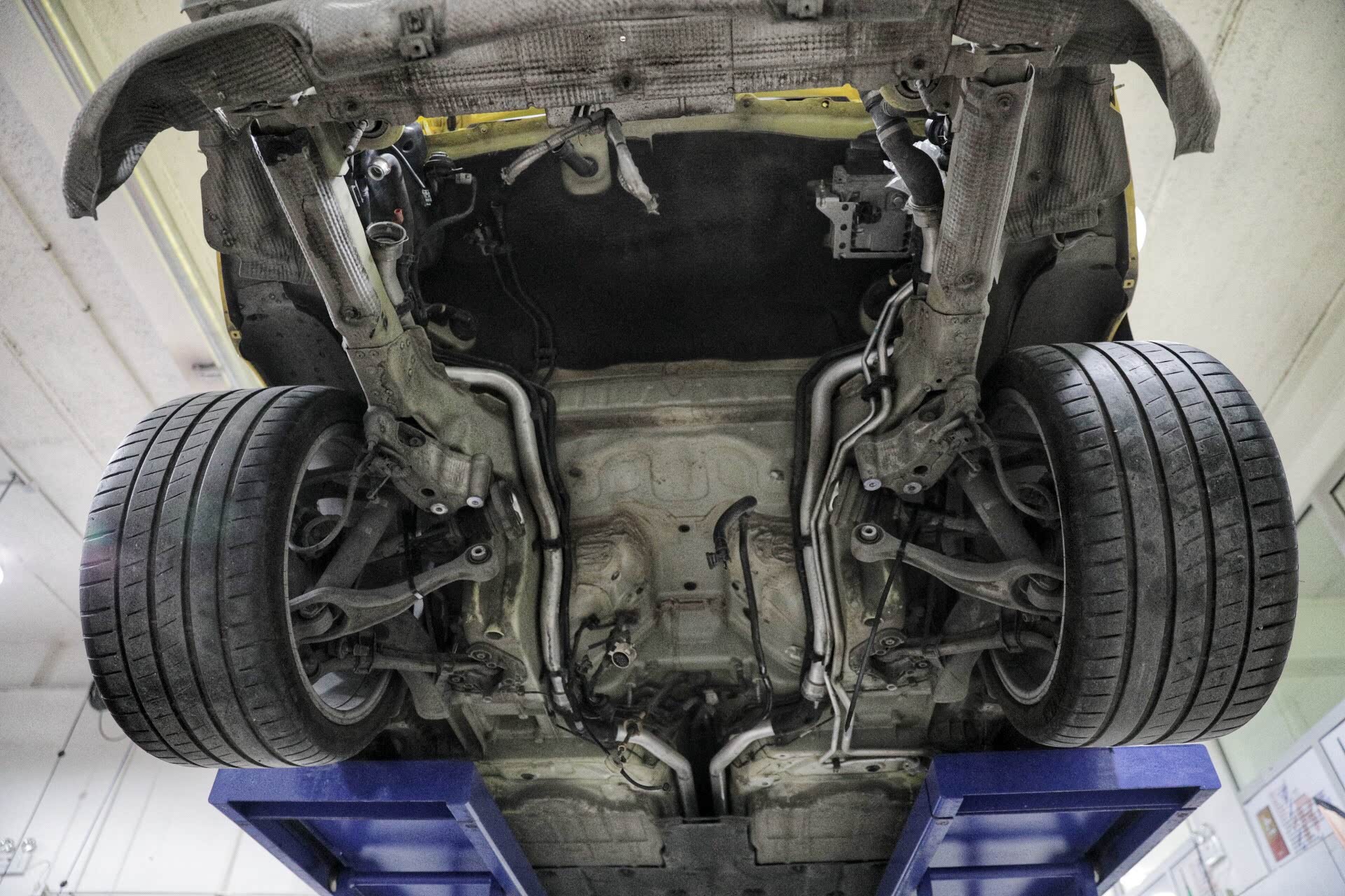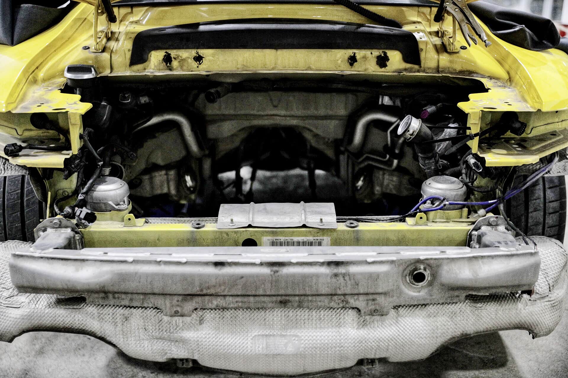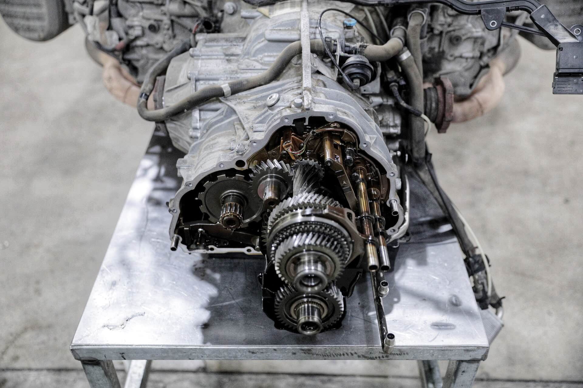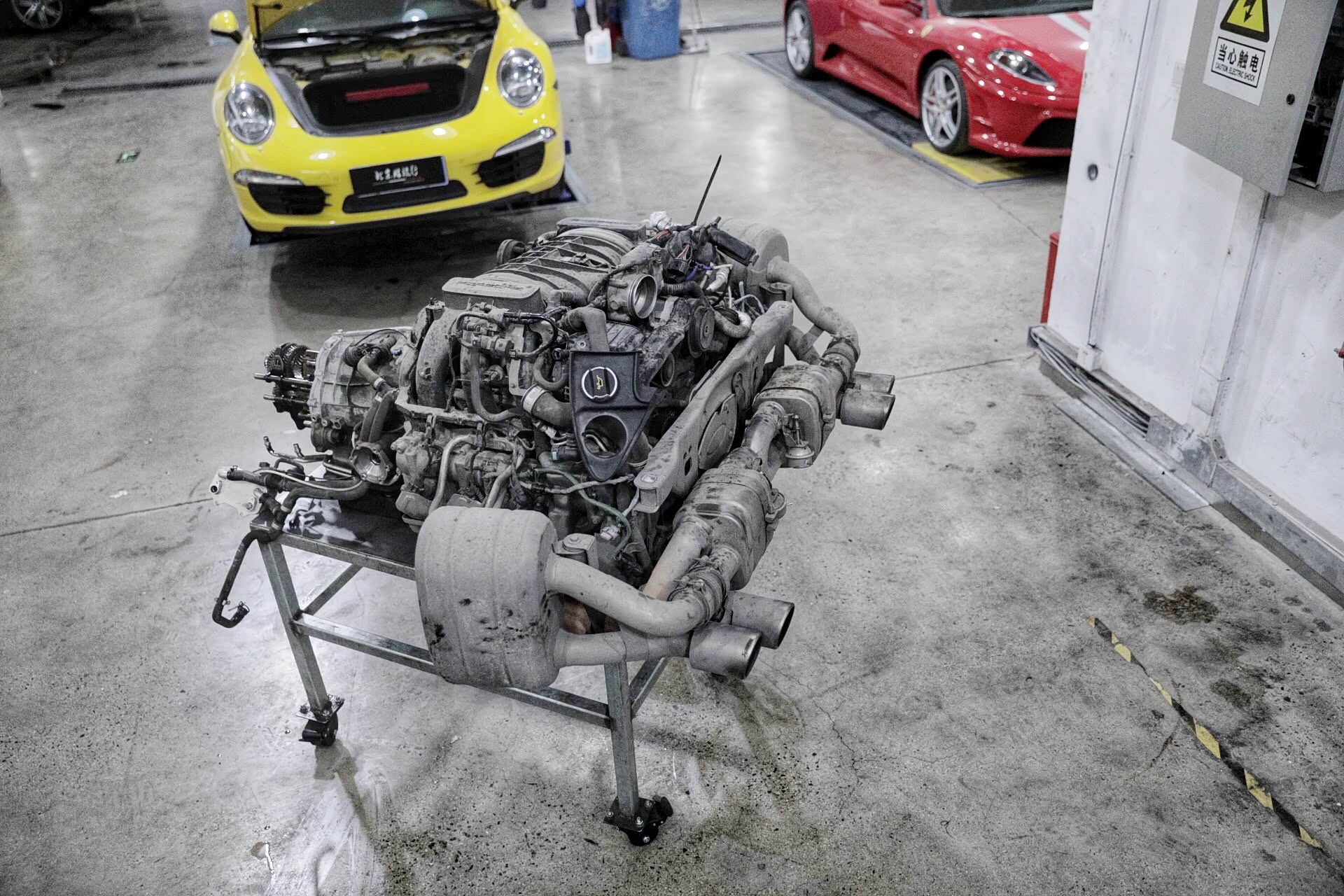 可能此时您会问,既然是变速箱出现了问题为什么不单独拆变速箱?答案很简单,因为保时捷911这款变速箱换挡机构在最后,所以很难单独进行拆卸。另外,对于保时捷911车型而言,发动机整体取下的工作量会较小,因为把线束及油水全部解决,从后车架直接就可以取下。