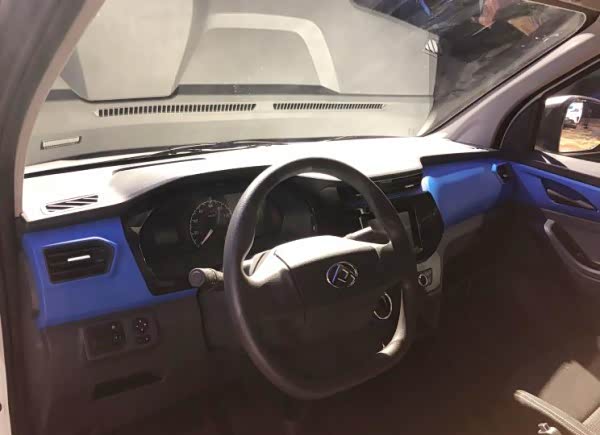 外观方面,大通EV30采用全新设计理念,封闭的前格栅和蓝色的饰条强调了纯电动车的身份,黑色A柱和相对独立的驾驶舱设计,与车身形成了黑、白撞色搭配,突出了它的货运用途。