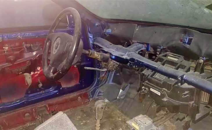 我们来看一下车内情况,已经什么都没有了,可能给店家当拆车件卖掉了,中控地方只剩下一个斑驳的方向盘。