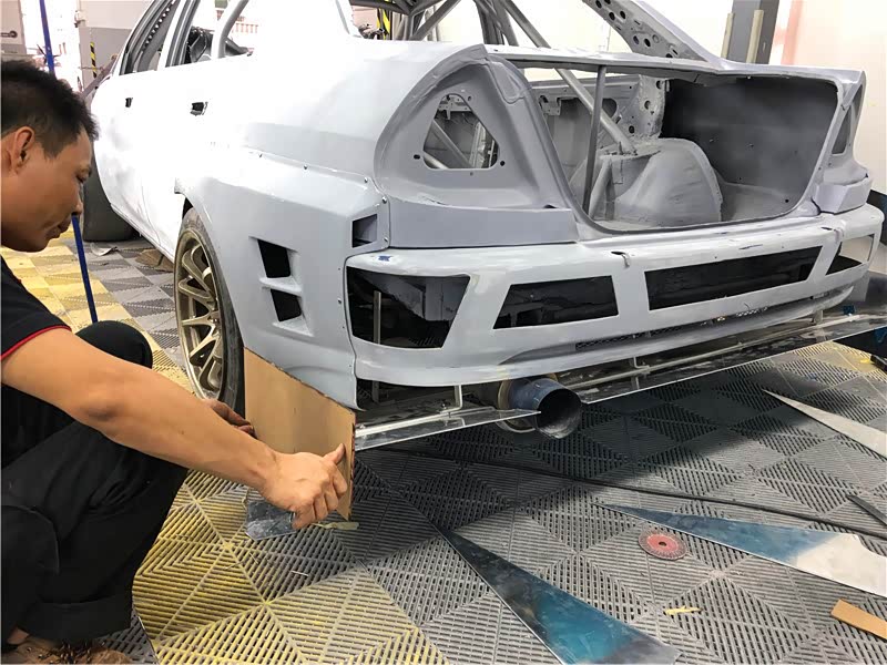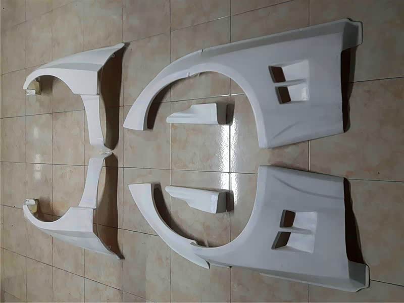 改装的包围是私人定制的,材料是玻璃钢的,通常缝隙和吻合度不是很高。所以改装对位难度系数比较高,这就得辛苦改装工匠们了。