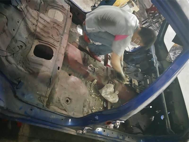 刮骨疗伤中整个车底盘的手术非常关键,而且难度系数也非常大,需要把车身侧立起来,然后把腐蚀掉的病灶切割掉,再从新加固焊接新的上去。