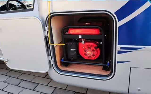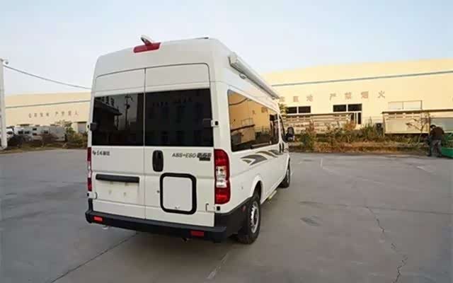 车身侧面有2.5kW汽油发电机一台,为车内电器和户外应急提供电力保障,尾部爬梯和自行车架依旧存在,加上长方形的大储物箱长度达1900m,能想到的东西往里塞就是了,车厢右边有两个门板可以做为外置烹饪操作台,外置作用在于烹饪时油烟不会过多流入车内,保证车内清洁度,车顶铺设一块太阳能充电板,为车内电瓶存储日常使用的电量。