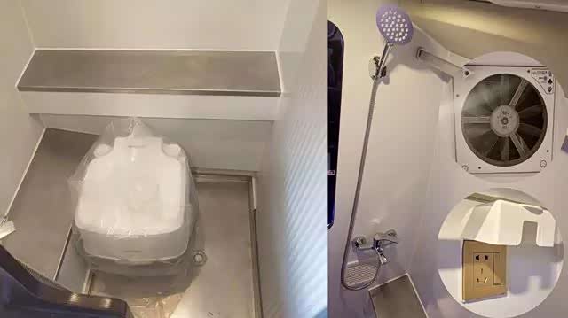 厨房提供下洗菜池、微波炉、车载冰箱、储物柜、220V五孔电源插座,日常饮食生活基本够用。卫生间有两处开门,一处向着车内的推拉门,另外一处则是右侧尾门,天气好的情况下可以讲右侧尾门拉开透气,非常方便。