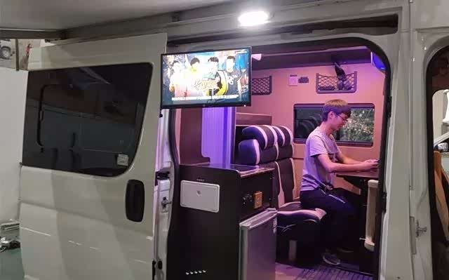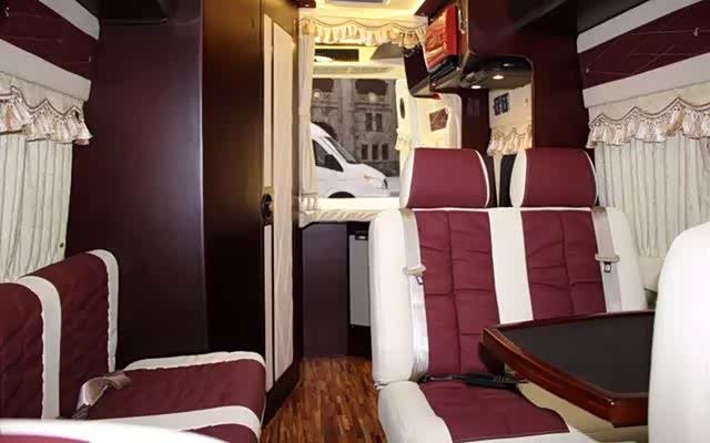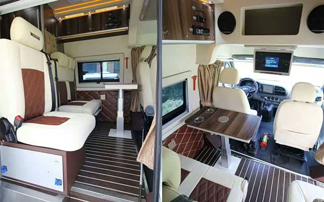 整车分为睡卧区、会客区、卫生间和烹饪区四个部分,过道的面积共用,为了最大限度利用空间,分为上为睡卧区下为储物柜,前睡卧区床板掀起有19寸多媒体屏幕,下方前排座椅可以向后旋转于后排座椅组成会客区,后排座椅可以放倒成一个单人床。