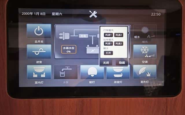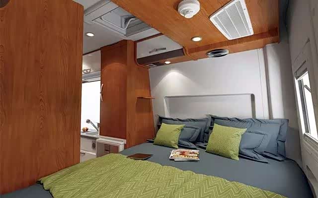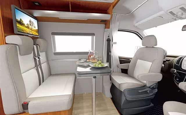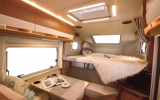 两张双人床可容纳4人出行和就寝,就寝空间和会客区开设三扇通风窗,配有纱窗和反光板,带来不错隐私保障,而会客区可升降的小桌板也可放平成为一个单人床。配置车载DVD音响系统和液晶电视,车内车外均可使用。房厢门上面触控屏是整个控制系统的核心,控制室内灯、射灯、浴室灯、空调、水泵等等一步到位。