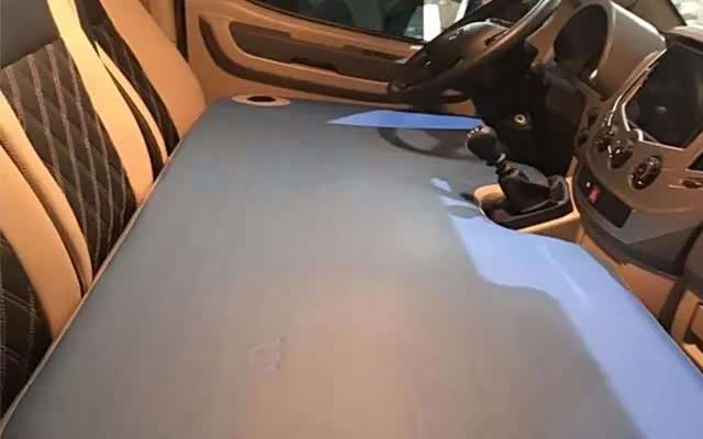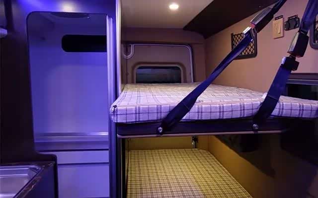 作为一款C型房车,整体5250/2036/2375mm车身尺寸,轴距3100mm,空间表现中规中矩,但内部空间利用却很到位,黑黄配色座椅放倒之后驾驶室还配备一个尺寸上为1750×800mm充气垫,连前排司机空间都利用上了。室内采用1800×600mm上下床设计,上床可以折叠,不使用情况下可以折叠当成一个储物空间,配备了不锈钢80L净水箱和40L灰水箱,相比塑料,不锈钢的抗腐蚀性来的更好。