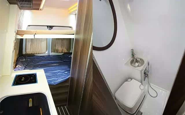 车内配有50L的车载冰箱、车载空调、多种氛围小灯,厨房单独出来一个柜子的设计非常美观实用,柜子上面为电磁炉和洗菜池,没事做个菜还是非常舒服的。配备80L的清水箱和两个60L的热水箱和灰水箱,洗手间有便携式马桶、淋浴花洒、挡水帘等等。