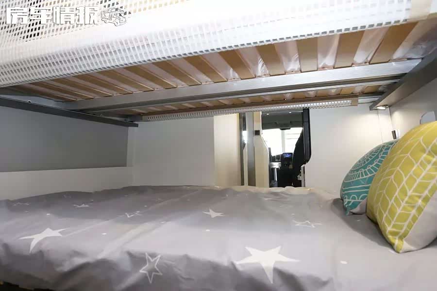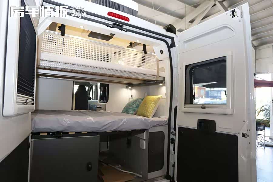 打开车尾门就是车内的主卧区了,为上下两张双人床铺,满足2-4人休息需求,上铺为升降床,下铺下方是储物仓,可放置行李等物品。