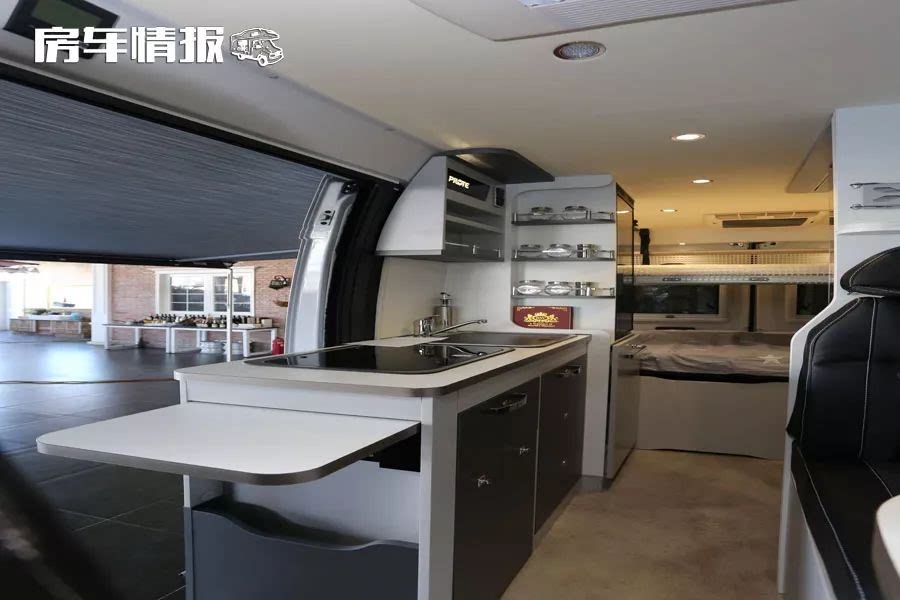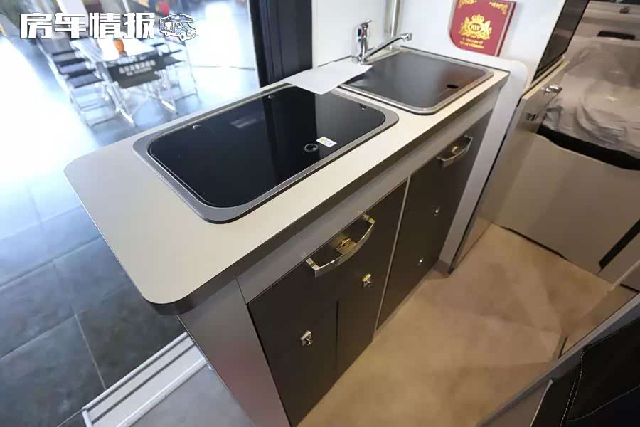 整体厨房位于车身侧门一处,配有常用的燃气灶、洗菜池、储物柜、冰箱等设施。操作台可向外拓展,增加厨房的使用空间。