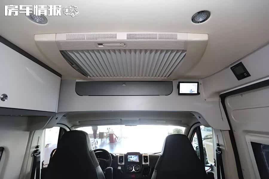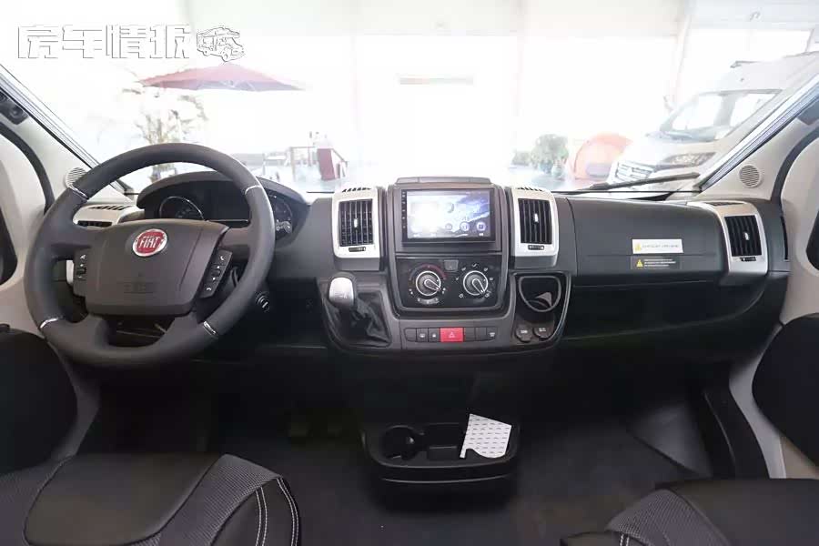 进入到房车驾驶室内,这款房车采用的是菲亚特DUCATO房车专用底盘,驾驶室的布局也是中规中矩,主副驾驶座椅采用仿皮材质。驾驶室内配有多功能方向盘,中控屏幕配有倒车影像、娱乐影音等功能。