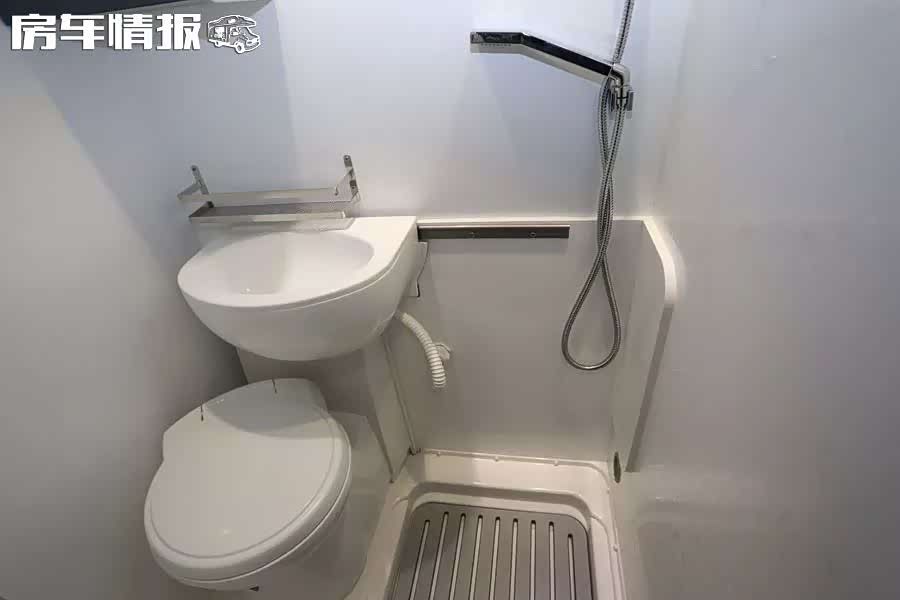虽然是一款B型房车,但是也配有封闭式卫生间,并且空间很客观,设施也比较齐全,配有电动粉碎马桶、洗手盆、淋浴等设施,除此之外这款房车配有110L的净水箱和80L的灰水箱。