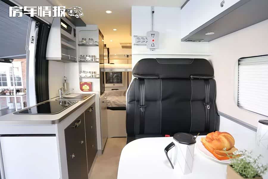 车厢前部是双人沙发座椅,均配有安全带,行驶途中可以乘坐,前方是可拆卸餐桌,并且配有拓展功能,同时驾驶室座椅可向后旋转,与后方沙发座椅形成4人对坐形式,方便在此处喝茶聊天。