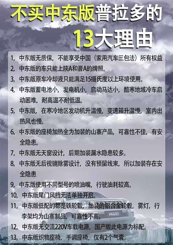 目前,同一配置的普拉多车型,中东版比国产版可以便宜4-5万元,竞争力不言而喻。而一汽丰田为了推销国产版本也使出浑身解数,还闹出过一些笑话。比如下图的“13大理由”,不是以偏概全就是虚构事实,不仅没法推销出国产普拉多,还帮中东版打了一波广告。