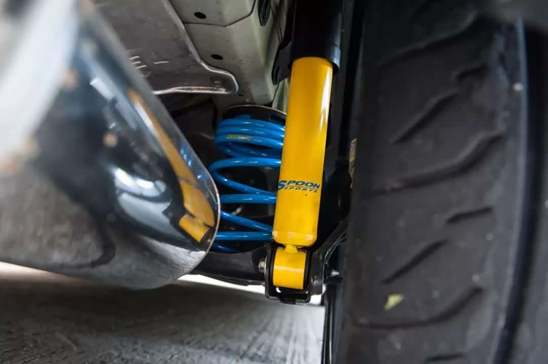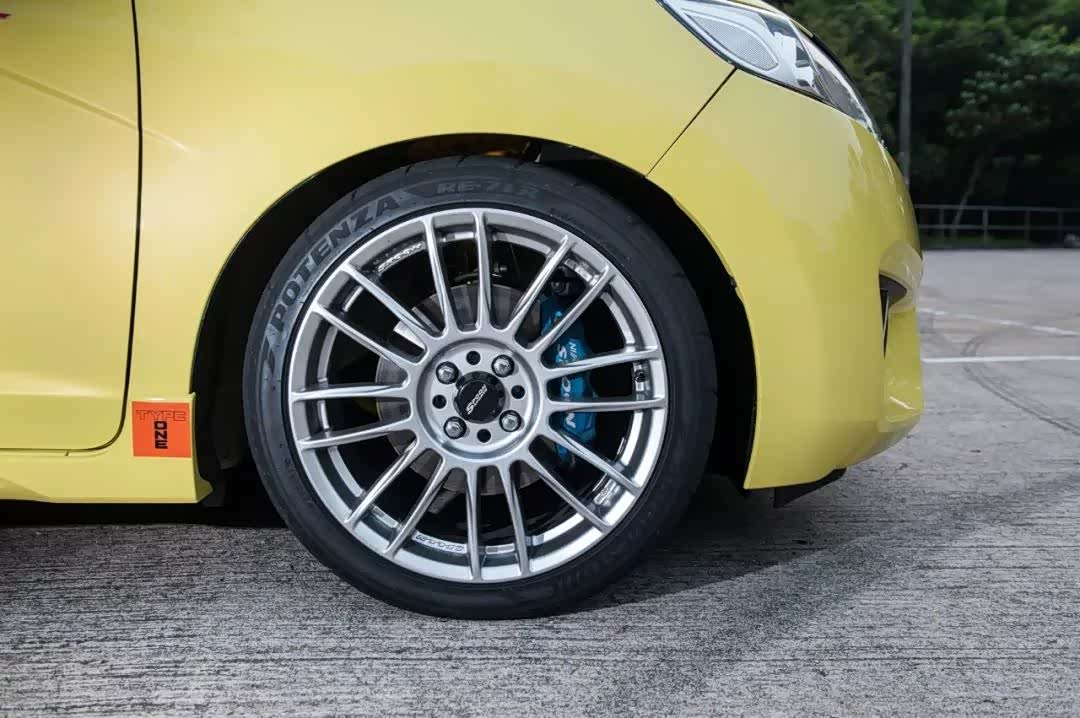 在避震器方面,GK5也是用上SPOON的产品,是一套原厂形式的避震器,但吸震力跟缓冲力比原装要强得多,适合较为激进的走行方式,弹簧配用则与一般的飞度产品不同,原有SPOON配用在GK5身上的为前2.5K后2.4K,但这台K20A GK5则是前6K后5K,比一般GK5用的硬得多,所以行驶起来也较为硬朗。