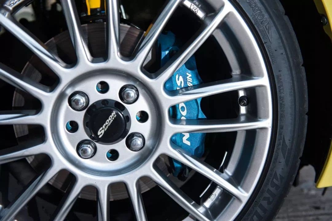 发动机已经换上了K20A的GK5在剎车方面绝对不能用上原装的产品,所以能够剎停这“怪兽”就要用上强大的刹车系统,而SPOON也有出品剎车系统,这一套剎车是Twin Block 对向四活塞剎车卡钳,这一套剎车系统可以套用在Type R身上,所以在K20A GK5身上也没有问题。
