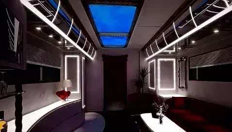 在车顶上,还配有自动升降机,只需一键便能升出一套桌椅,坐在车顶上喝茶观赏风景,可谓是一种别致的体验,车身的长度高达12米,车内的面积也足足有20平方米,豪华的程度堪比7星级酒店。