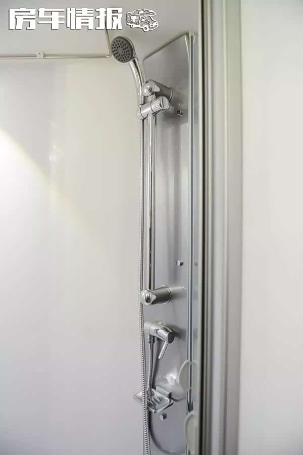 淋浴区位于旁边的封闭空间内,整体设计与家用无异。想必在水源充足的情况下,在房车内部也能好好洗个澡了,再也不是简单糊弄糊弄的感受了!