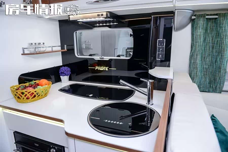 车厢中部是厨房区,空间毫无局促感,与在家做饭无异,配有三芯燃气灶、洗菜池、抽油烟机、烤箱等,最值得一提的是厨房对面的大容量冰箱,可存放不少新鲜食材。