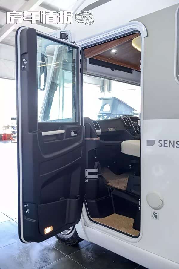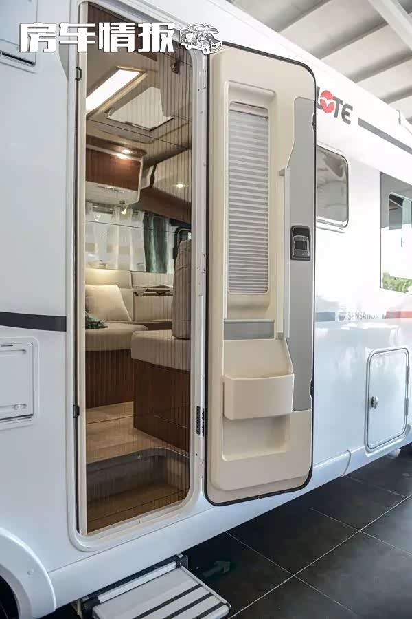 车厢侧门为房车专用车门,下方配有电动脚踏,内部配有纱门,防止蚊虫进入,又可实现通风换气。