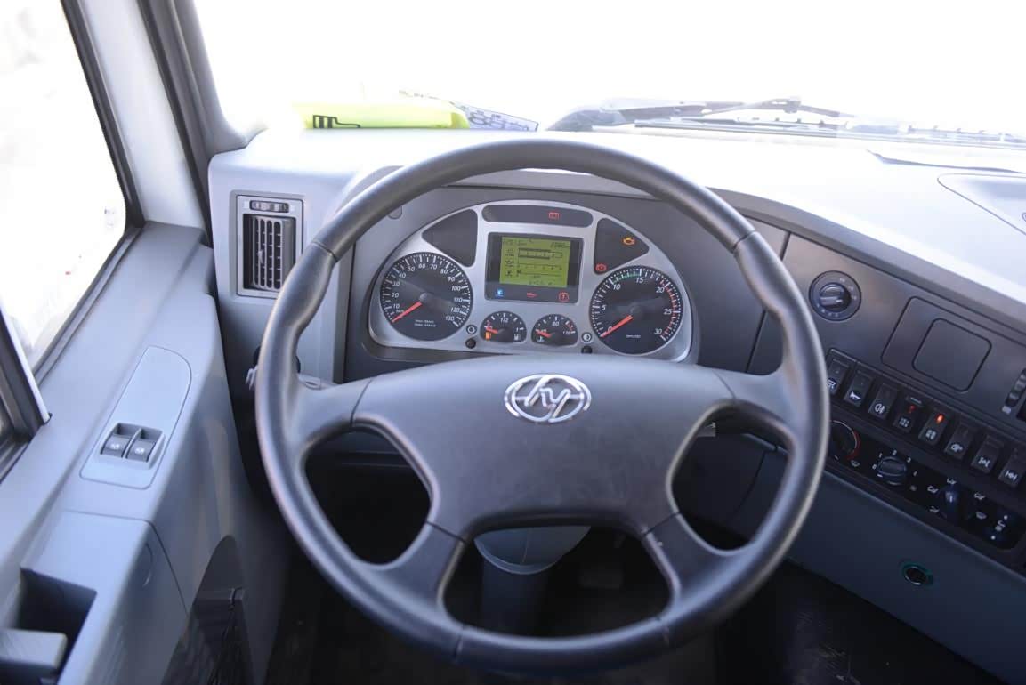 即使采用平顶的M500驾驶室,驾驶室内部空间也没有受到限制。虽说不能在里面站立,但是车顶距离头部还是有非常大的距离,不会觉得压抑。四副式方向盘造型非常简洁,后面的仪表盘上带有一块黑白LED液晶显示器,显示车辆的基本状况。M500的驾驶室完全能够适应混凝土运输工况,而且驾乘舒适性还非常的优秀。