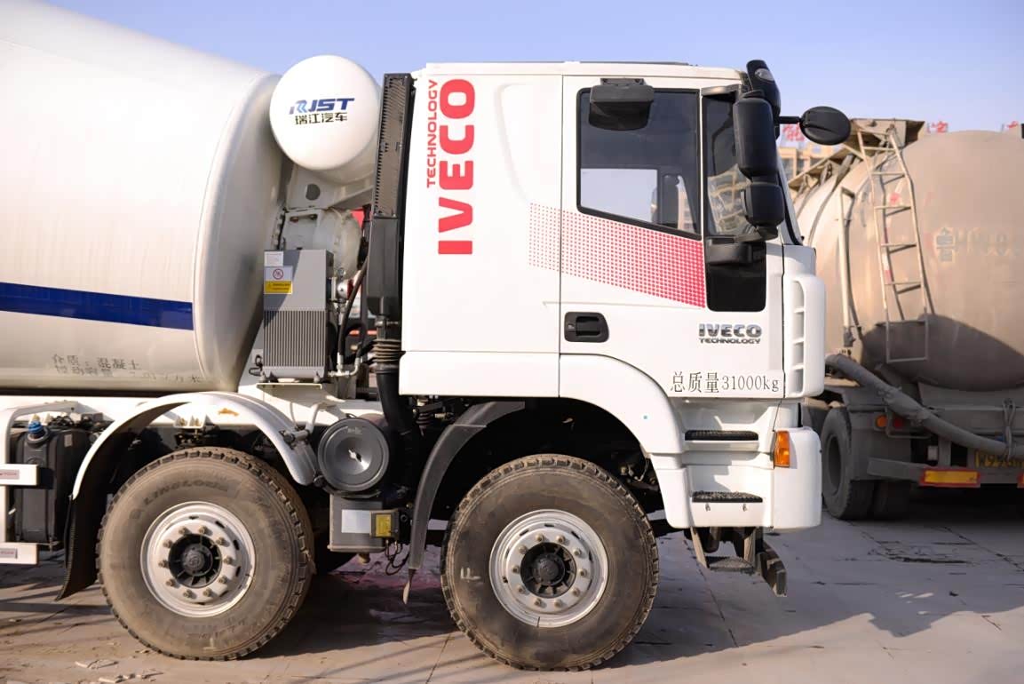 上装搭载的是中集瑞江为上汽红岩打造的混凝土搅拌罐,采用成套出售的销售形式,整车的外观尺寸为11850×2550×3990mm。红岩杰狮M500混凝土运输车加上上装的整备质量为15.5吨,四轴车辆的总质量可以达到31吨,也就是说除了车辆自重以外还可以拉差不多15吨的货物。该车搭载的是20方的混凝土搅拌罐,而滚动装载质量只能达到7方。因为一立方米的混凝土差不多是2吨,装载7方的混凝土就已经达到车辆的标准载重了。