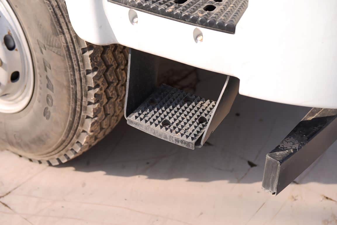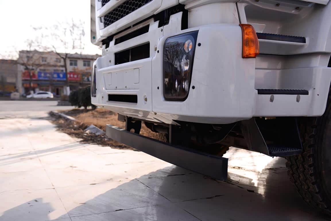 保险杠采用全钢制结构,防剐蹭损坏,是工程车的标配。车灯使用的是杰狮的标准组合透镜大灯,混凝土运输车一般都是夜间在城区运营,所以说车灯的明亮程度非常关键。前围最下面设计成了一个45°的斜角,但是受到下面防钻钢梁的影响,限制了这些提高通过性保护车辆部件的设计。