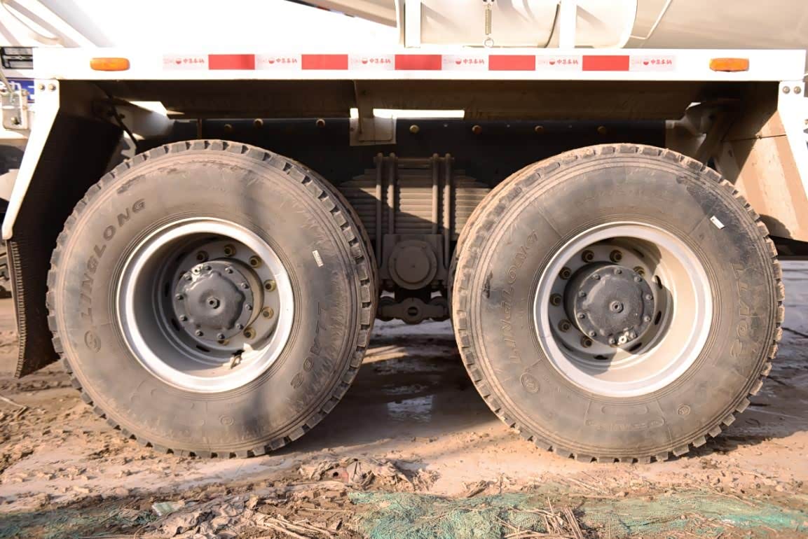 与这一套配置相匹配的是红岩的H8B双级驱动桥,主减速比为5.214,也是主流混凝土搅拌车的配置。全车安装的都是20寸的加强钢制轮毂,匹配的也是12.00R20钢丝胎,都是保证车辆承载能力的配置。