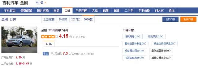 口碑方面金刚表现一般只有3.75分,我认为它最大的缺点就是平台老旧,动力较弱,而且油耗还不低,悬架硬、后排空间小、乘坐舒适度地、廉价感明显,是车主反映最多的问题,希望吉利能着手解决。