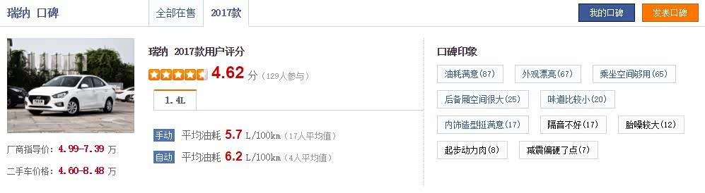 口碑表现瑞纳算是同级别的佼佼者。有点就是油耗低,空间大。但是缺点也比较明显,隔音差,胎噪明显,起步动力肉,悬挂偏硬,不过对于一台4.99万的小车来说这也是能接受的,比较价格在那放着呢。