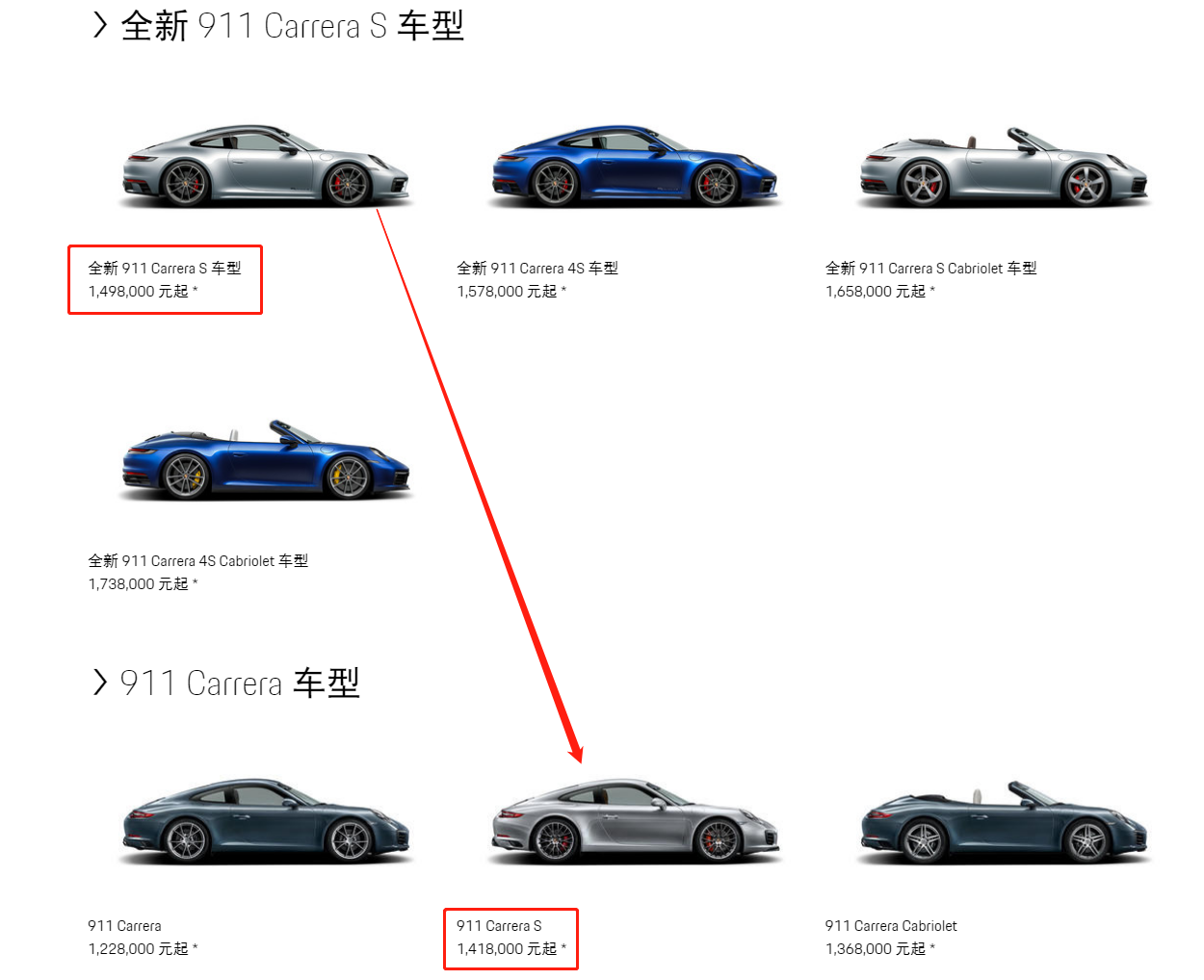 首先是配置器的主页更新了全新 911 Carrera S四款车型,依旧是分为四驱和敞篷。起售价为149.8万-173.8万,可以看到与现款911 Carrera S的售价相比,新款贵了8万块。预计新款911 Carrera 的售价也会相应上涨,但不知道正式上市后会不会调整。