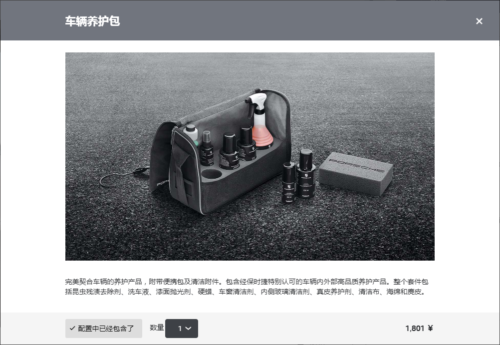 如果你对它爱的深沉,那更应该亲自给它来一个全套的SPA,这一点保时捷也为你考虑到了,这个包全套的养护产品都齐活了。
