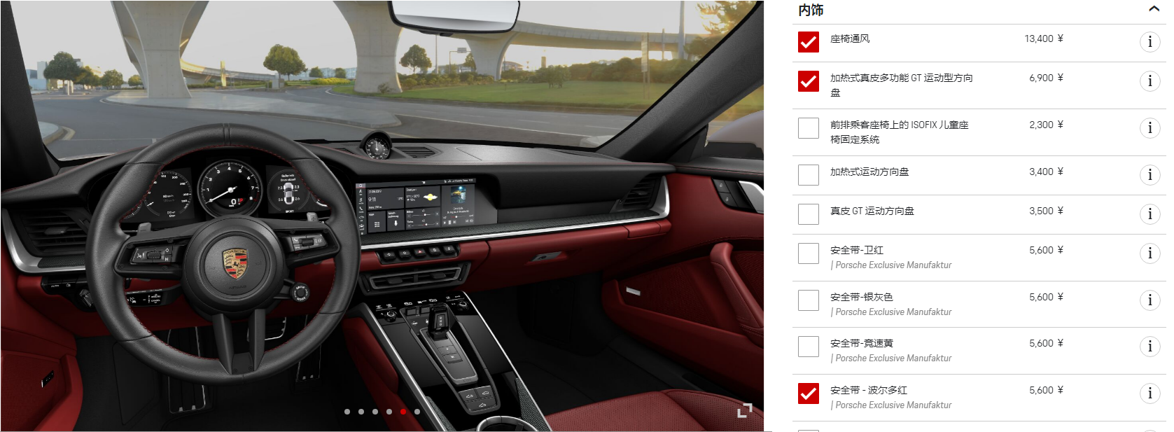 新款911使用的是8速PDK,更加强大。这是我按照自己的喜欢选配的内饰,很遗憾仪表和SC的小表不能选颜色,但因为是液晶显示,估计可以变换背景吧。我选了碳纤维内饰组件,从图片完全看不出变化。