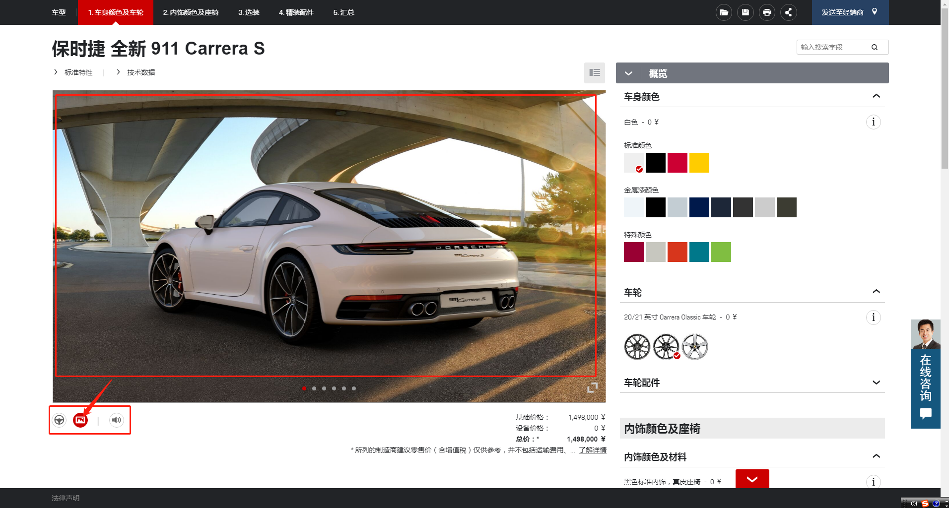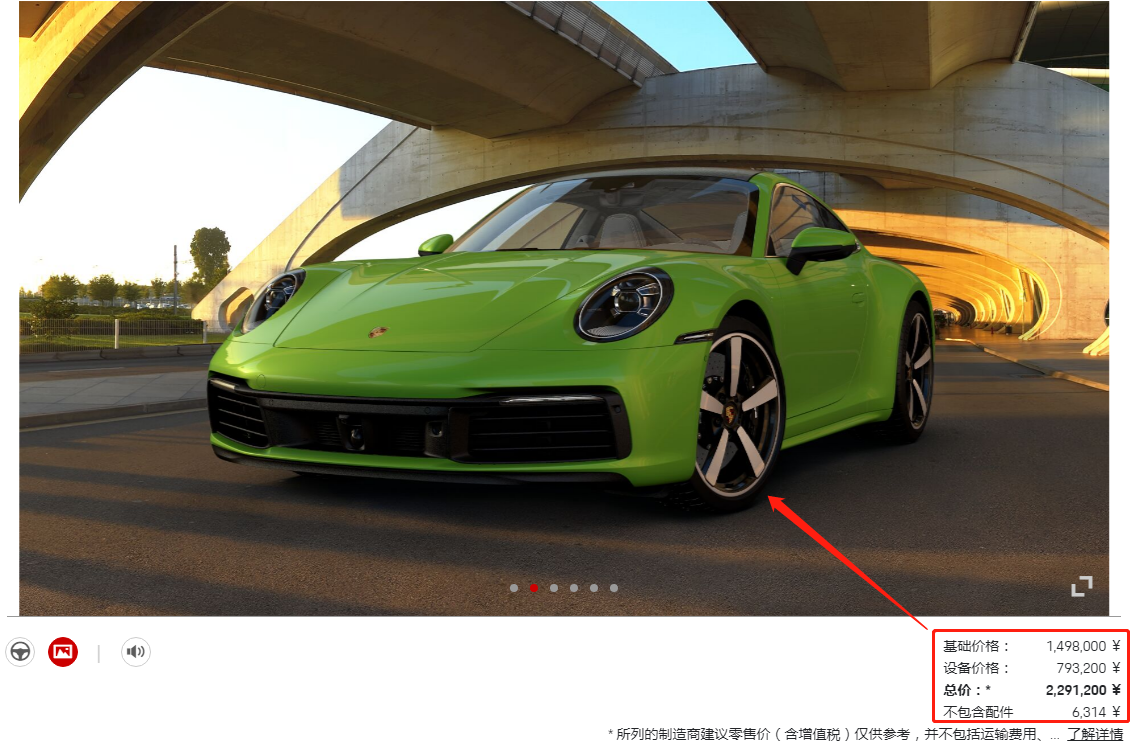 配置器上半部分有了很大变化,车辆背景不再是以往的纯色背景,配以自然环境的背景让视觉效果更加真实,你也可以选择切回之前的纯白色背景。而且眼尖的同学也能看出来,配置器的首图变成了车尾部,而不是之前的车头图片,因为这一代911外观变化比较明显的就是尾部啦。