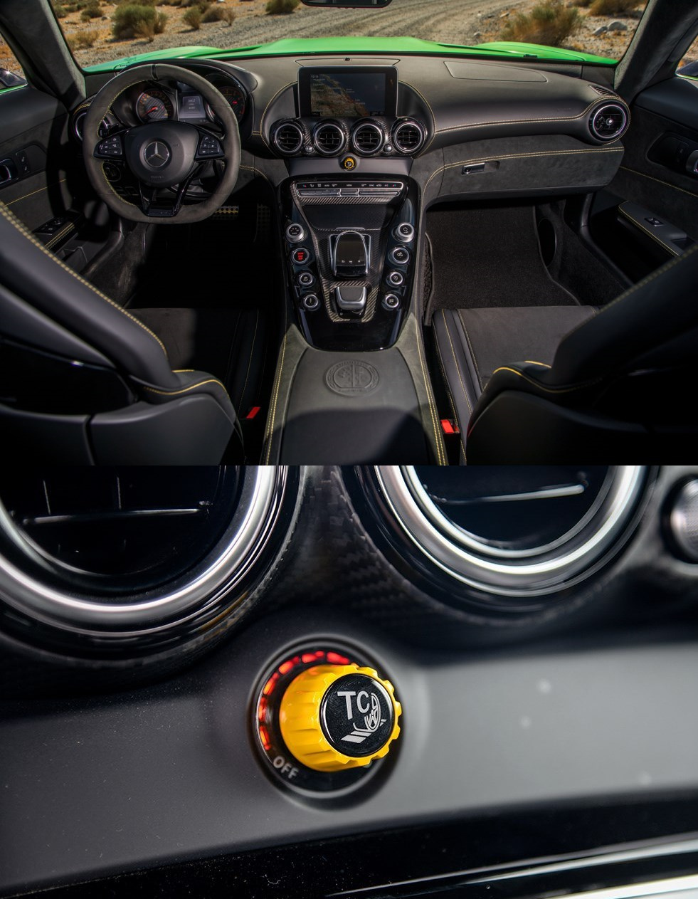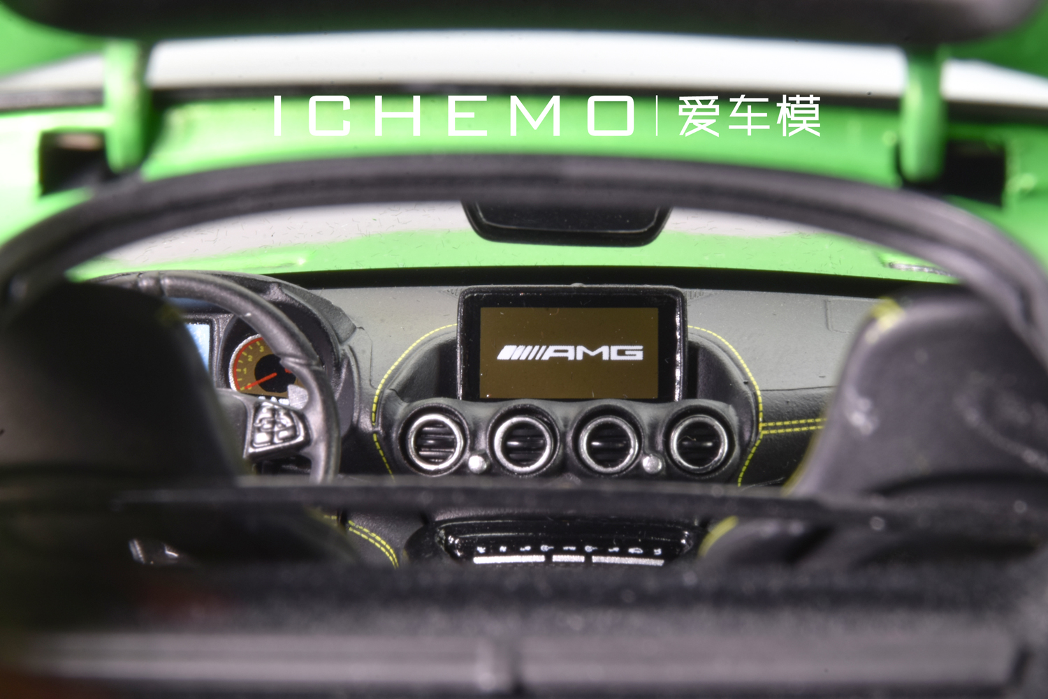 AMG GT R 座舱内最具话题性的配置就是位于中控屏幕下方的 9 段牵引力控制旋钮,“大猩猩”克拉克森用乐高块形容它。此部分细节在模型上有所体现,但因比例问题没能刻画出旋钮上的图案,另外在配色上与真车旋钮有所出入:实车为黄边黑面,模型为黑边黄面。