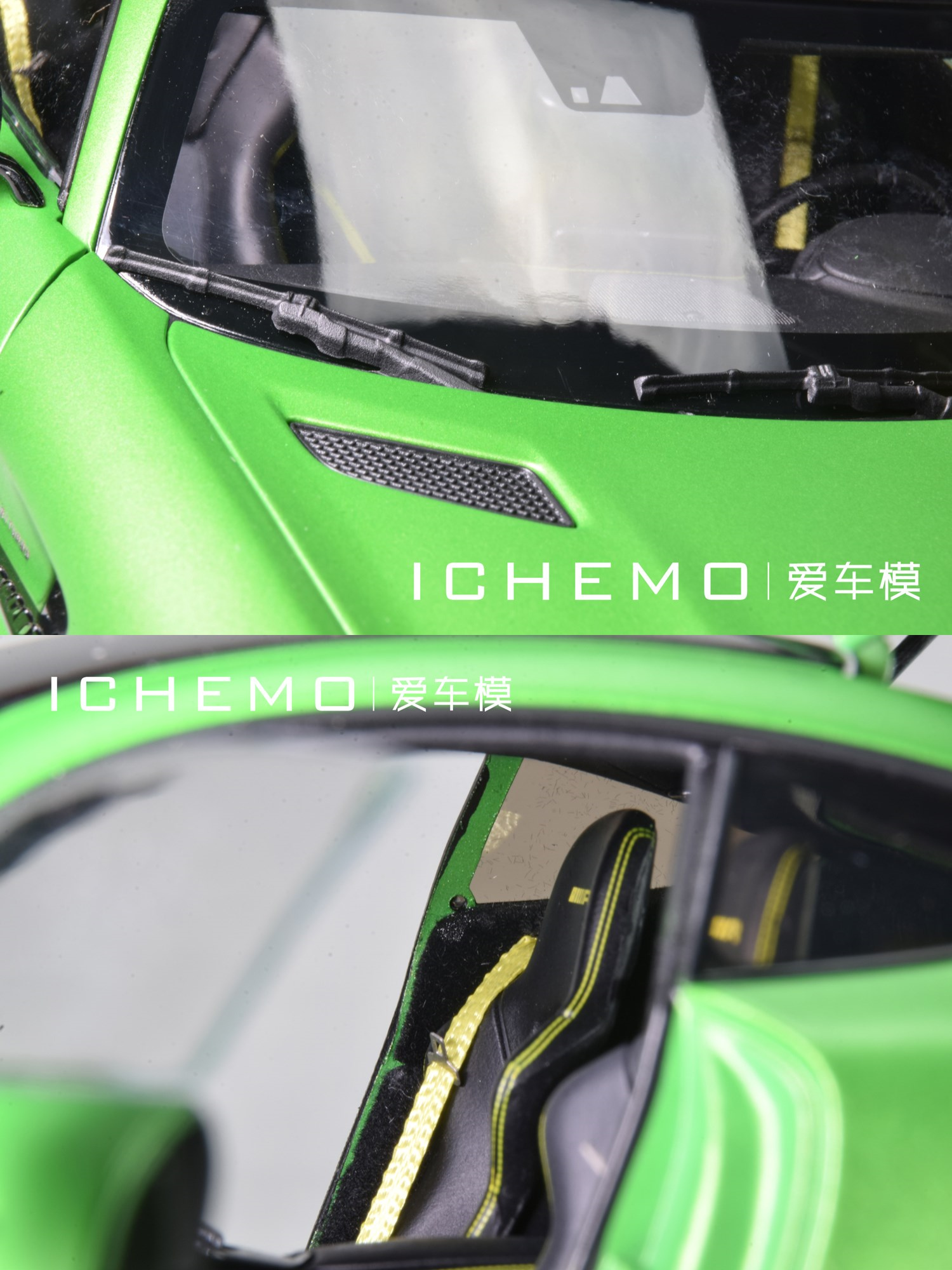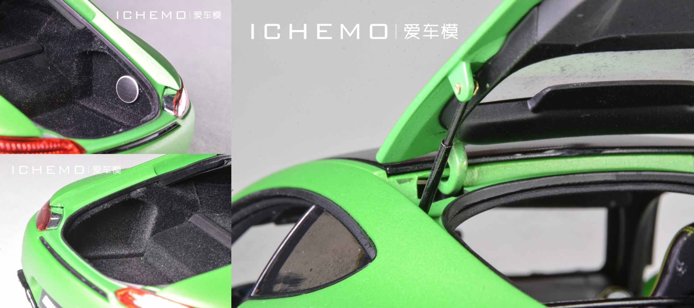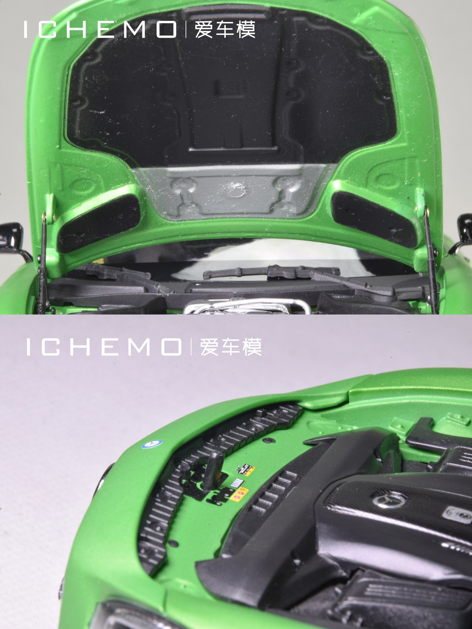 模型为合金四开工艺(主体为锌合金材质):两侧车门、发动机盖和后备箱盖零件可以打开;两款配色均为金属漆面,但魔焰绿因漆面特殊性采用了更为繁琐的人工打磨和喷涂工艺。哪个配色更得你心呢?